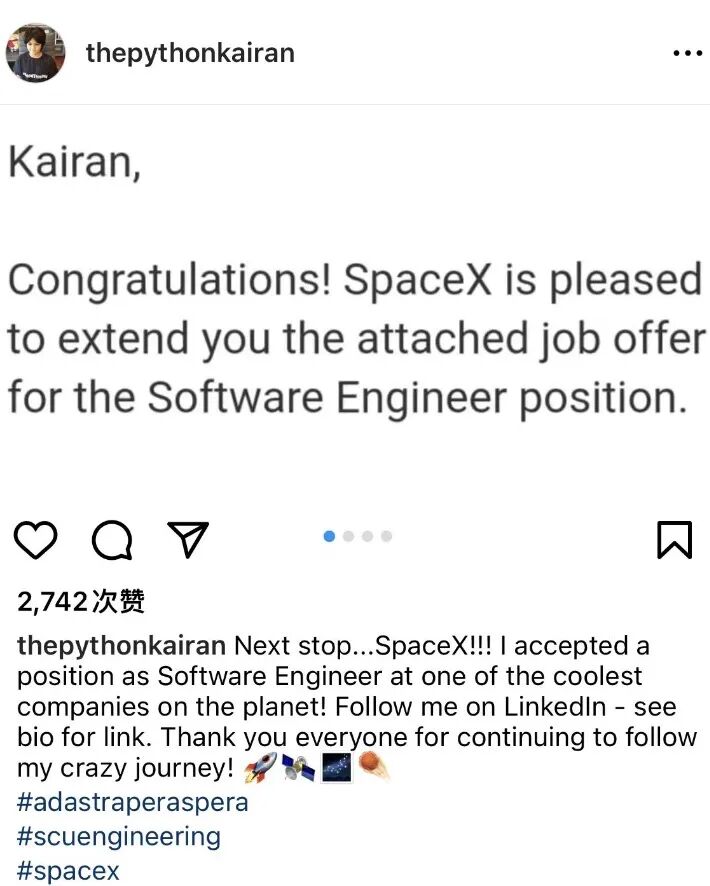 据媒体报道,凯兰于2009年生于美国旧金山湾区,父母都是孟加拉裔美国人,他的爸爸还曾经是一名化学工程师,母亲是华尔街高管。在凯兰很小的时候,他就表现出异于常人的天赋。2岁的凯兰已经能说出完整的句子。据美国《洛杉矶时报》报道,凯兰在幼儿园时就会收听美国国家公共广播电台,并把他听到的故事讲给老师和同学。父母发现了他异于常人之处,医生的鉴定也让他的家人确定凯兰就是一个双商(智商和情商)极高的天才。到他上小学三年级时,他的智商已经超过180,超过99.9%的人类。于是,凯兰在7岁时开始学习编程;9岁,凯兰被送入当地一家社区大学学习;10岁,凯兰便获得了英特尔实验室的实习机会,从事生成式人工智能的相关研究,他曾在社交媒体上表示,英特尔的这段经历“改变了他的职业轨迹”;11岁时,凯兰转学到美国圣塔克拉拉大学,开始计算机科学与工程的系统学习。凯兰在接受《洛杉矶时报》采访时说,正是在大学环境中,“我觉得我所学习的内容才符合我的水平。”而今,年仅14岁的凯兰刚刚从美国圣塔克拉拉大学毕业,是该校172年历史上最年轻的毕业生。能拿下SpaceX的offer,凯兰凭借的除了他在学习上的高智商,还有大学期间相当辉煌的校内外经历。在大学期间,他不仅加入了校内计算机机器协会,担任联合学生会的高级参议员,还被任命为辅导员,为那些比他大得多的同学们辅导课业。此外,他自10岁起就是英特尔人类AI实验室的一名研究合作者,该实验室主要推进开源的预测性语音生成平台,凯兰参与开发了开源语音预测生成平台——下一代霍金ACAT系统。在英特尔实验室的实习,凯兰已经坚持了4年。根据凯兰的LinkedIn简介,去年6-9月他曾在网络情报公司Blackbird.AI担任了四个月的机器学习实习生,期间帮助设计了一个“异常检测统计学习管道”,以确定社交媒体内容的操纵性。此外,他还是麻省理工科技评论的客座作家,并曾经登上Shift AI发表主题演讲。这一份履历,即便放在人才济济的硅谷也依旧亮眼,更何况他还是个年仅14岁的少年。除了日常工作学习外,凯兰的课外生活也非常丰富。他透露自己正在努力和家人学习孟加拉语。早在2019年也曾有媒体报道过他,当时他就在自学中文和中国功夫。目前,凯兰正准备在 7 月份正式入职 SpaceX:“我对我生命中的这一新篇章感到非常兴奋。”尽管智商超群,成长和学习履历一路跳级,但天才的成长也并非一帆风顺,在找工作上面,即使有着众多光环加身的凯兰也因为年龄的原因多次被拒绝。据凯兰自己称,在过去的一年中,他一共递出了97份求职申请,但只有三家公司给了他机会,SpaceX是其中之一。今年4月,凯兰在ins上发了一条动态:为一份重要工作的面试做准备,进入“紧张和成熟”的氛围中。6月,凯兰就宣布了喜报:“下一站……SpaceX!!!我接受了地球上最酷的公司之一的软件工程师的职位!!!!”据悉,凯兰要加入的是SpaceX的卫星互联网Starlink团队,可谓是核心部门里的重要岗位。在正式获得SpaceX的offer前,凯兰共经历了10轮面试。据求职网站数据,SpaceX录取率仅0.2%,比进哈佛还难。但是极高的入职难度同时也对应着丰厚的回报,SpaceX的软件工程师年薪高达14万-21.6万美元,折合人民币约100万-150万。能通过SpaceX的面试,无疑是很多计算机毕业生的梦想。凯兰的加入也创下纪录,成为SpaceX最年轻的软件工程师。他感谢SpaceX是少数不用年龄作为判断申请者成熟度和能力的公司之一,而SpaceX的招聘经理相信他有潜力成为顶尖工程师,这也让他备受鼓舞。值得一提的是,按照华盛顿地区的法律,SpaceX可以合法雇佣凯兰,因为他恰好踩中了最低法定工作年龄。提到凯兰所选择的SpaceX,人们就不得不提到马斯克——另一位不折不扣的天才少年。事实上,作为凯兰的老板,马斯克一直坚持要和最厉害的人才共事,并曾在SpaceX的招聘页面写过一句话:“SpaceX就像一支特种部队。我们在做别人认为不可能完成的任务。”这也让SpaceX成立不久后便组成了一支明星团队。SpaceX的首位工程师便是马斯克在参观火箭制造车间时看到的一名扛着80磅火箭推进器的瘦高男子,当场面试,在问了大量细节问题后,成功将其挖到Space X。推进部门首席技术官Tom Mueller曾在美国最大发动机制造商TRW工作过15年,参与过研发阿波罗登月飞船着陆动力系统。此外,麦道飞行公司“大力神”火箭首席设计师Chris Thompson,波音公司Delta火箭测试主管Tim Buzza也都被马斯克揽入麾下。因此,SpaceX也曾一度被一家美国职场信息权威社区Glassdoor评为“Best places to interview”(最佳求职公司)。在SpaceX成立的前六年时间里,马斯克参与了SpaceX前1000名员工中每一个人的招聘工作,甚至包括保洁、门卫。多年的经历让马斯克形成了一套自己成熟的“HR”哲学,即坚持招聘顶尖人才。马斯克曾表示:“创业的话,更要想尽办法,找到最厉害的人才。”他自己也一直践行这个原则。据传,马斯克经常向大学咨询“谁是最勤奋、最聪明、且未婚的研究生”,并在第一时间联系,就近面试,一旦发现人才,立马发出offer。大学是他获取人才的途径,但马斯克绝不是唯学历论者。他认为:“如果一个人从一所优秀大学毕业,可能意味他有能力做大事,但事实未必如此。你看比尔·盖茨、埃利森、贾伯斯等人,都不是大学毕业生,但如果你有机会雇用他们,那当然会是个好主意。”在特斯拉人工智能部门招聘时,马斯