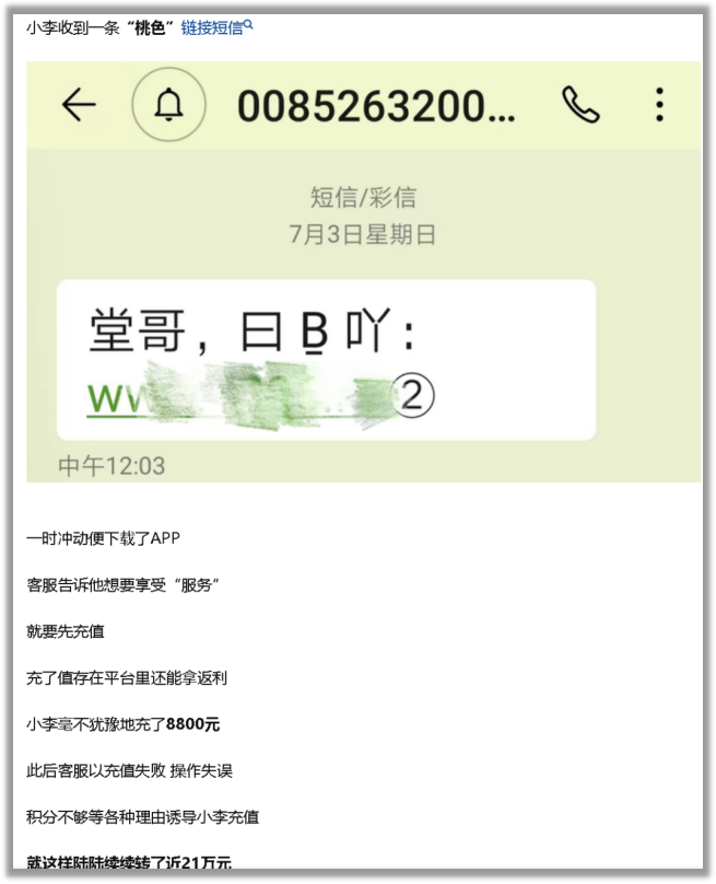 来源 | 雷叔写故事(ID:raistlin2017)该文章内容仅代表作者本人观点,不代表本公众号立场。这些天办公室里好多同事都在吐槽:最近收到好多黄色短信。有趣的是为了不被系统屏蔽,这条短信简体繁体混用,还加了符号,努力的样子像极了小学时候玩QQ空间的非主流。要不就是开头虚晃一枪,让你以为是熟人打招呼,接下来又一转诈骗:不得不说,有些人第一次收到这种消息,内心还是有些慌张的。总觉得是不是不小心上了某些不可描述的网站,结果自己的个人信息被暴露了。但接连收到这种垃圾短信轰炸,那种担忧很快就变成恼火了。去微博查了下,不止我们办公室,好多网友都收到了类似短信,甚至还上了热搜:只可惜有时候涉黄短信先下手为强,直接让机器人给你读出来的,光是想象一下那个场景就能让我尴尬癌犯了。相比之下,我觉得那种一眼假的“枪决通知短信”,多少还有点可爱了。到了这份上,没收到诈骗短信的人反而破防了,觉得犯罪分子看不起他:看着一条比一条离谱的诈骗短信,或许会有人好奇,犯罪分子发这些一眼假的东西到底谁会上当?但我想说的是,如果你能发现“假”,那么一开始就不是诈骗分子瞄准的对象。之前B站看到一个警官科普,“骗子的普通话为什么这么差?”也是这个道理。并不是说骗子们都不愿好好练习普通话,如果这些人连这么蹩脚的普通话都分辨不出来,那么他后续被骗的可能性就很大,这类人群才是骗子的目标用户。这正是他们利用遴选机制的最低标准最高效率地最有可能转化的受害者。如果你真的看到这些涉黄消息动了歪脑筋,那你下一步受骗上当的可能性就提高了不少。不过还好,即便是你一时鬼迷心窍点开了,咱们的反诈中心还是会提醒你:你以为点开以后有美女裸聊,进了以后才发现其实就是让你下APP的,里面不是有色情直播就是网络赌博,大图我是不敢放了,大家自行感受一下:当然,无论它玩什么花样,唯一共同点在于都在叫你打钱。接下来的剧情,想必大家都很熟悉了。如果你抵御不住诱惑,可能过几天你们小区就要挂上类似的标语了:那些上当受骗的人,不知道屏幕对面将要脱光衣服的对象往往是同性,往往是AI,往往只是一串代码……即使是一串代码,也可以通过语言撩拨,让人缴械投降。这对应了网友们一个经典的疑惑:为什么看上去被骗的人都好有钱?学历不低,社会阅历也丰富的受害者们还可能经历戏中戏的折腾:裸聊被骗,民警追回诈骗款后,再去裸聊又被骗,共损失近6000元。激情的欲望,暴富的奢望,患得患失的急躁,不能不占小便宜等心理都可能被人利用,越本能的心理越容易被抓住。当电信诈骗席卷而来的时候,其实是无关乎蠢或傻,只关乎你第一时间有没有拒绝。说到底,犯罪分子们这么了解我们的喜好,准确掌握我们的信息,多半是因为我们的隐私早就被卖了。互联网公司收集用户数据,才能更精准地给你推荐商品。更过分的是那些直接售卖用户数据,明码标价的,就已经突破我能接受的底线了。