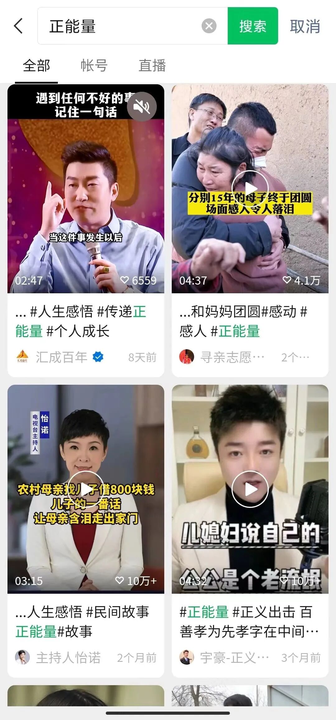 家庭故事、正能量等关键词,然后会出现视频,看那些封面图一眼就很糙,没有个人 IP 出镜的视频