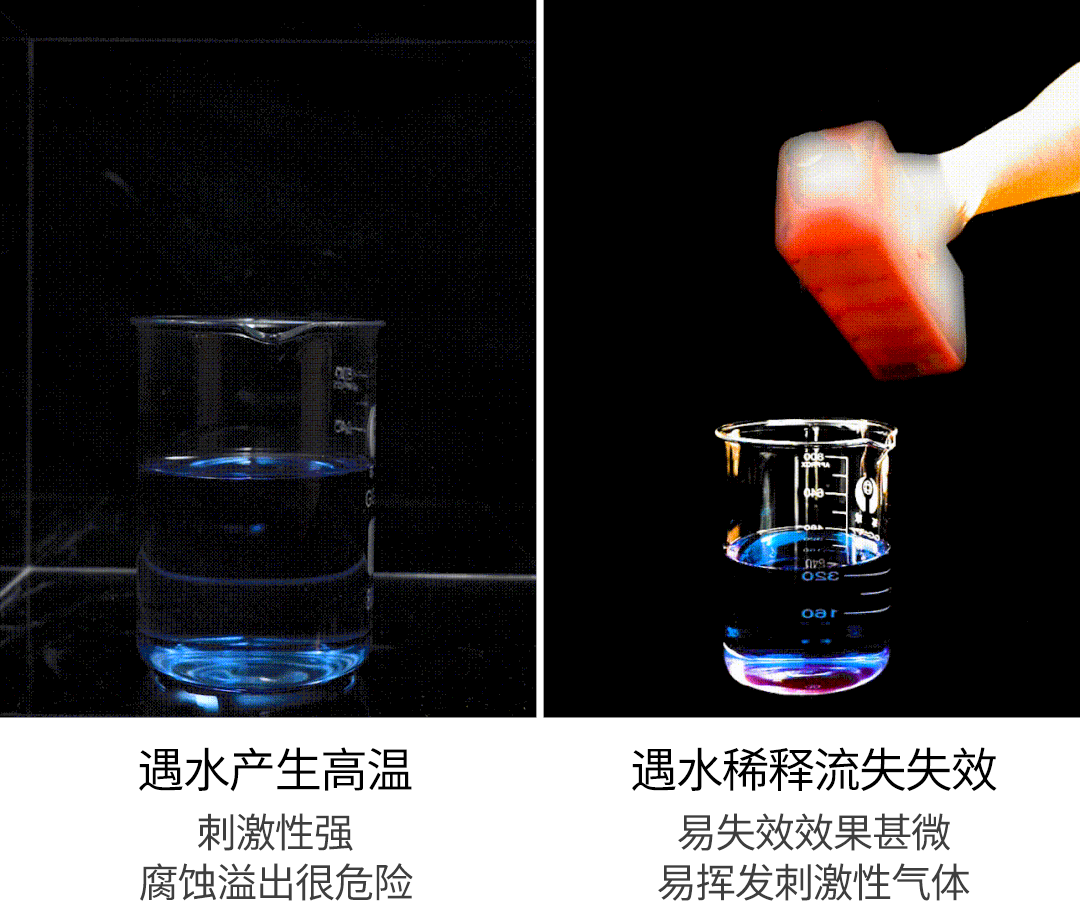 腐蚀性大,且活性太强、不稳定,遇热水会产生大量气体!