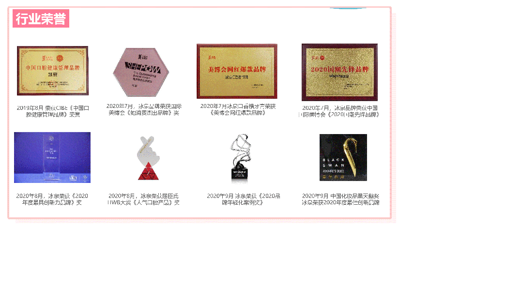 凭实力斩获了《中国口腔健康管理品牌》、《2020国潮先锋品牌》、《她消费杰出品牌》奖等多个奖项荣誉。