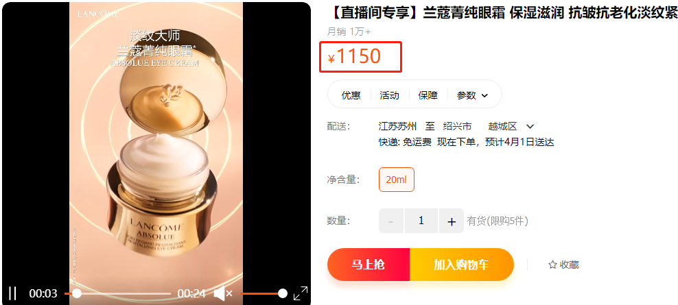 并且现在优惠力度大,20ml的兰蔻菁纯眼霜专柜售价1150元