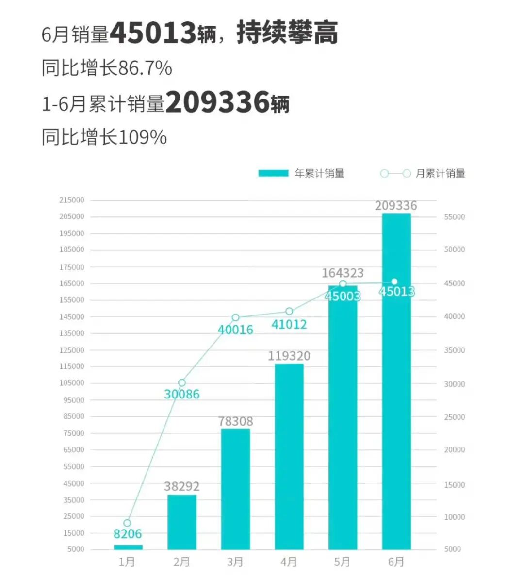 在今年的 6 月份,埃安单月交付 45013 台新车,实现同比增长 86.7%,一举坐稳了新势力交付的第二把交椅;截至 6 月份,在 2023 年的埃安累计交付超过 20.9 万台新车,实现同比增长 109%。