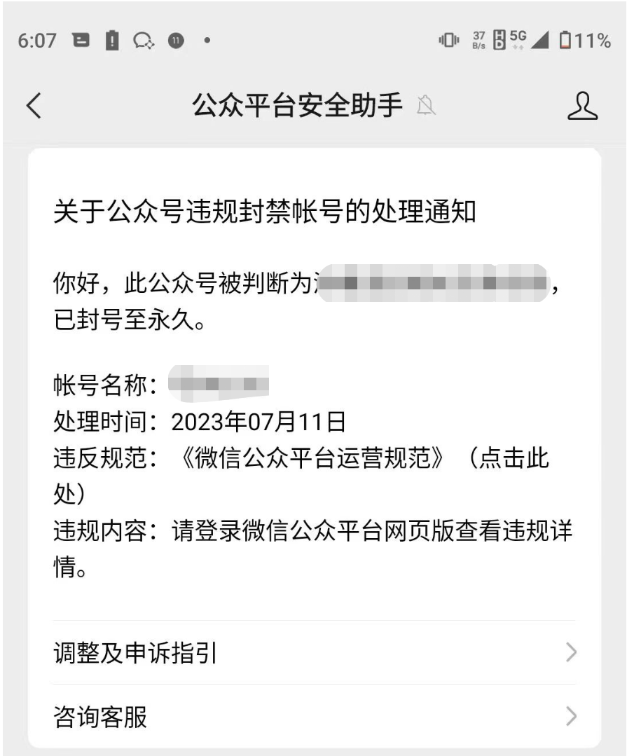 就在群里面聊天挂了不久,我们项目负责人反映,我们操作项目的公众号挂了,小几万精准粉丝,一年能带来不少收益,直接干永久了,损失还是有点大,这个账号一年没有发内容,菜单都比较注意,最后还是挂了。