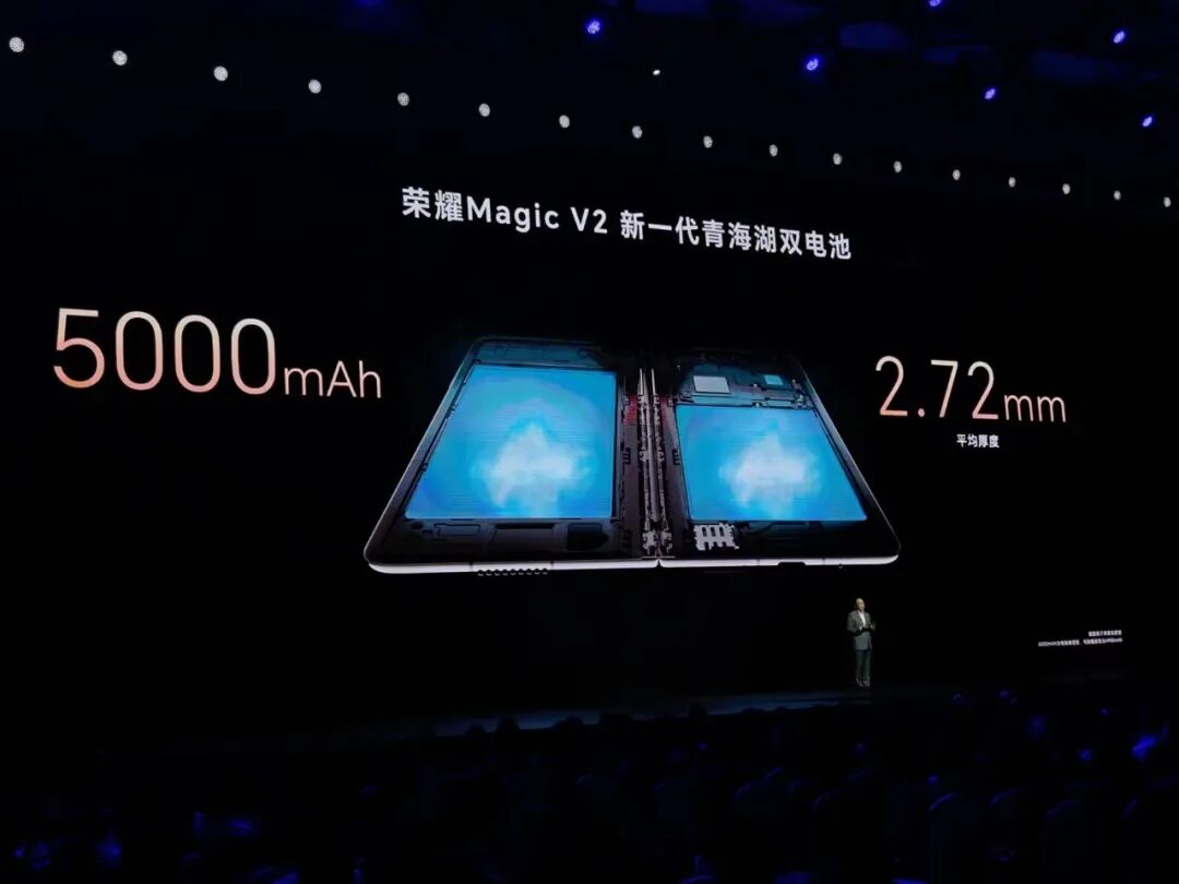 在荣耀Magic系列的另一个强项续航方面,Magic V2第一次将青海湖电池技术应用在了折叠屏手机中。如何在更薄、更小的空间内放入足够容量的电池,是极具挑战性的问题。为此,荣耀改进了电池的正极材料,提升了电池的能量密度,同时通过“一层聚合式”屏幕驱动架构设计方案增加电池空间,最终让Magic V2维持了5000mAh电池容量。根据公开数据,这也是目前业内容量最高、厚度最薄(平均2.72毫米)的一块折叠屏电池。根据实际测试,Magic V2可以连续播放14个小时以上的大屏视频,一天高负载使用没有问题。![]()