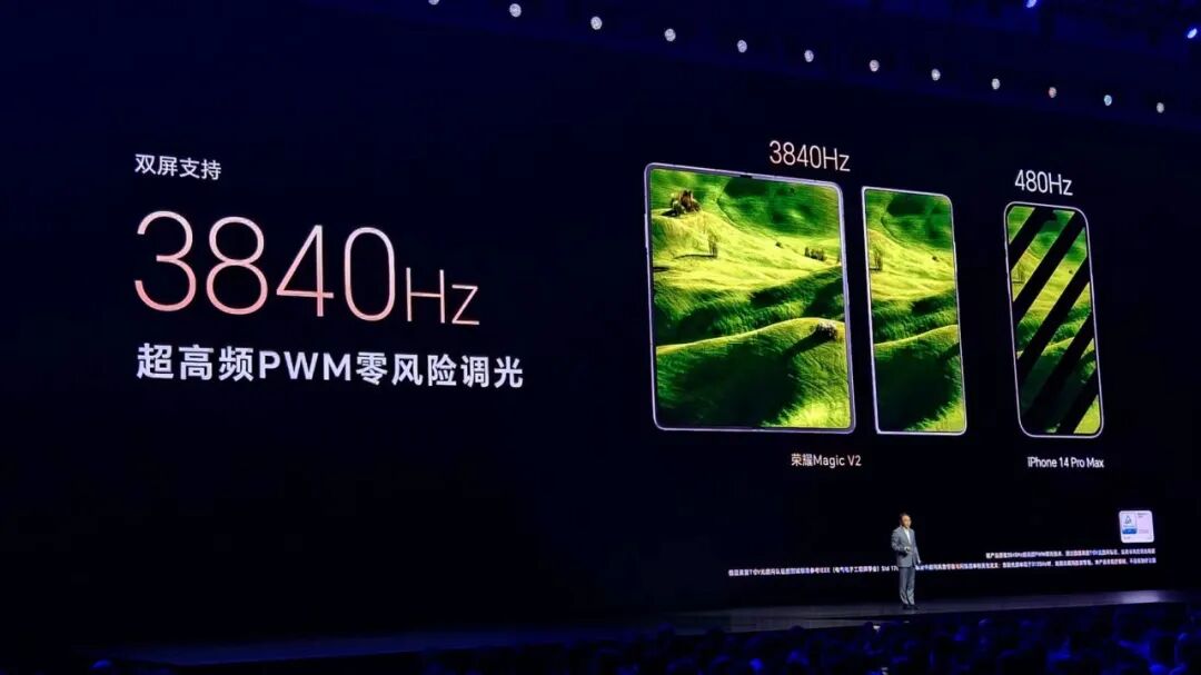 这种追赶甚至超越iPhone直屏旗舰的续航体验,扫除了折叠屏成为我们日常主力机的最核心障碍之一。值得一提的是,荣耀还将其在续航领域积累的技术进行了下放,基于独创的三芯架构硬件设计、OS Turbo X引擎智能调度,让今天同期发布的荣耀手表4实现了10天续航,这也是eSIM智能手表续航首次进入“两位数时代”。最后,在屏幕显示方面,荣耀多年的技术积累也可圈可点。此次Magic V2的内外两块屏幕均支持3840Hz高频PWM调光,这也是此类高频调光技术第一次在折叠屏手机中应用落地。值得一提的是,Magic V2行业首发了荣耀与中国标准化研究院联合开发的“动态光护眼技术”可以降低用眼疲劳。![]()