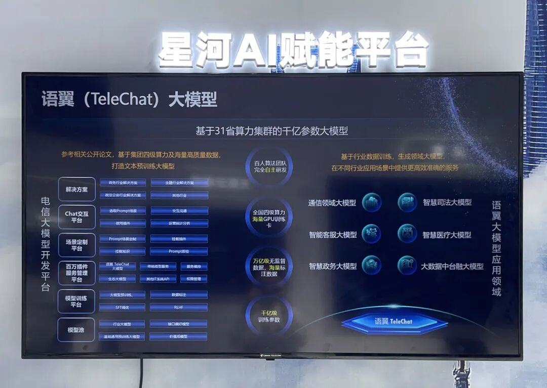 除了通用大模型外,多家企业展出了更具针对性的、面向垂直场景的行业大模型以及能够为每个客户量身定制及私有化部署的定制服务。中国电信展示了基于31省算力集群的千亿参数语翼(TeleChat)大模型,能够为通信、智能客服、智慧政务、智慧司法、智慧医疗等应用场景提供更高效准确的服务。![]()