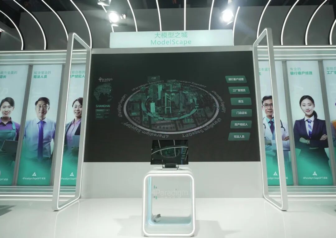 很多通用大模型已经闻名业界,比如有多款被冠有“国产版ChatGPT”之称的多款大语言模型,包括清华大学计算机系知识工程实验室的千亿参数中英文对话模型ChatGLM-130B、复旦大学自然语言处理实验室的MOSS、百度“文心一言”、阿里巴巴“通义千问”、科大讯飞星火认知大模型、商汤商量中文语言大模型、云知声山海大模型等。在多模态大模型方面,WAIC的展品有上海人工智能实验室“书生通用大模型体系”,使用人类自然语言就能直接调用企业软件的第四范式式说大模型、360集团认知型通用大模型360智脑、依托京东云10余年智能对话经验、预计参数量千亿级的京东云言犀大模型等。▲第四范式“大模型之城”展示了大模型结合不同行业后的真实实践