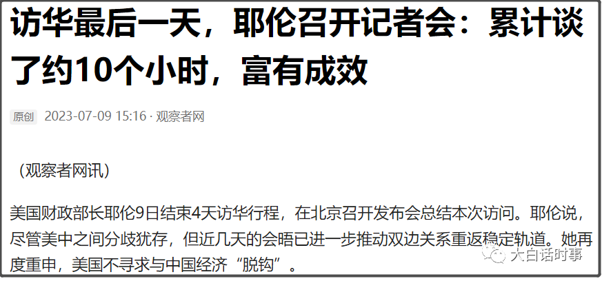 耶伦负责嘴巴上放鸽,但又给不出实质性让步,自然不会有什么结果。要是未来哪天,看到美国财长、商务部长、贸易代表,三人同时过来,才有可能是真正要谈。此外,耶伦这次发布会,虽然比布林肯那次要稍微和善一些。但耶伦在发布会上,也说了她在跟我们对话时,所谓“施压”。耶伦还说,美国将继续采取必要的有针对性的行动,以保护我们的国家安全利益和我们盟友的安全利益。由此来看,美国对我们发展的遏制,并不会因为耶伦访华,而有任何改变。耶伦在7月8日,还宴请了一些所谓“女性经济学家”,耶伦还说“虽然中美存在分歧,但这些并不是与中国人民的分歧”。我这里想说,美国现在这样不择手段的遏制中国的发展,这叫跟中国人民没分歧?美国不让中国产业升级,不让中国发展,就是不让中国人民过上好日子。所以,这次耶伦访华,虽然看起来态度比布林肯要友善一些,但实际绵里藏针也不少。但去年11月12日,耶伦参加巴厘岛峰会之前,曾公开说,中美之间的紧张关系源于中方的“误解”,并声称中国应该“理解”美国“采取行动”的原因,美方并非试图阻碍中国的经济发展。耶伦这话说起来就挺搞笑的,这是中国“误解”了美国吗?美国过去这几年,从特朗普到拜登,一直用实际行动不断遏制我们发展,还说这是误解?就连特朗普时期加的不合理关税,到现在拜登都还没有取消掉,这叫做误解?纽约时报最近报道耶伦访华时,还信誓旦旦宣称,耶伦要让中国相信,美国以安全名义阻止中国获得半导体等技术,所采取针对中国的一系列措施,并不是为了损害中国经济。英国金融时报,今天有一个报道标题是《耶伦:美国投资审查机制不会损害中国》耶伦的说法,相当于说,我要打你,但你不能还手,得理解我打你,不会伤害你。我们在各种场合说过无数遍,当前中美关系困局的症结所在,是美方抱持错误的对华认知,导致错误的对华政策。如果美国还抱着一边用实际行动来对我们各种制裁、软脱钩,还要一边让我们不要“误解”。未来一段时间,我们和美国的关系,仍然还会处于一个打打谈谈、边打边谈的常态。最近很流行“谈妥论”,动辄说中美已经谈妥了,准备联手对全世界割韭菜。在我们提出“人类命运共同体”概念的时候,就等于是拒绝了美国所谓G2论。其实,美国所谓G2论是一个陷阱,如果我们跟美国一样搞全世界收割,看似很爽,但实际是自毁城墙。所以,那种脑补中美私底下已经谈妥的,有点太过于沉浸在自己虚构的脑补里。结果布林肯离开后,又动辄大放厥词,拜登也是对我们出言不逊。并且,美方执法人员以涉芬太尼为借口,在第三国采用“钓鱼执法”诱捕中国公民的行为,已经成为中美双方一个新的冲突点。双方的博弈,并没有因为布林肯访华而缓和,反而有激化态势。然后“谈妥派”就又脑补说,别看明面上打得激烈,私底下已经谈妥了。然而“谈妥派”仍然信誓旦旦宣称,我们会私底下买一堆美债,来跟美国联手收割世界。结果,今天外交部领事司提醒在美和拟赴美中国公民注意安全,主要就是“美国以各种借口对入出境美国的中国公民滋扰盘查”。![]()