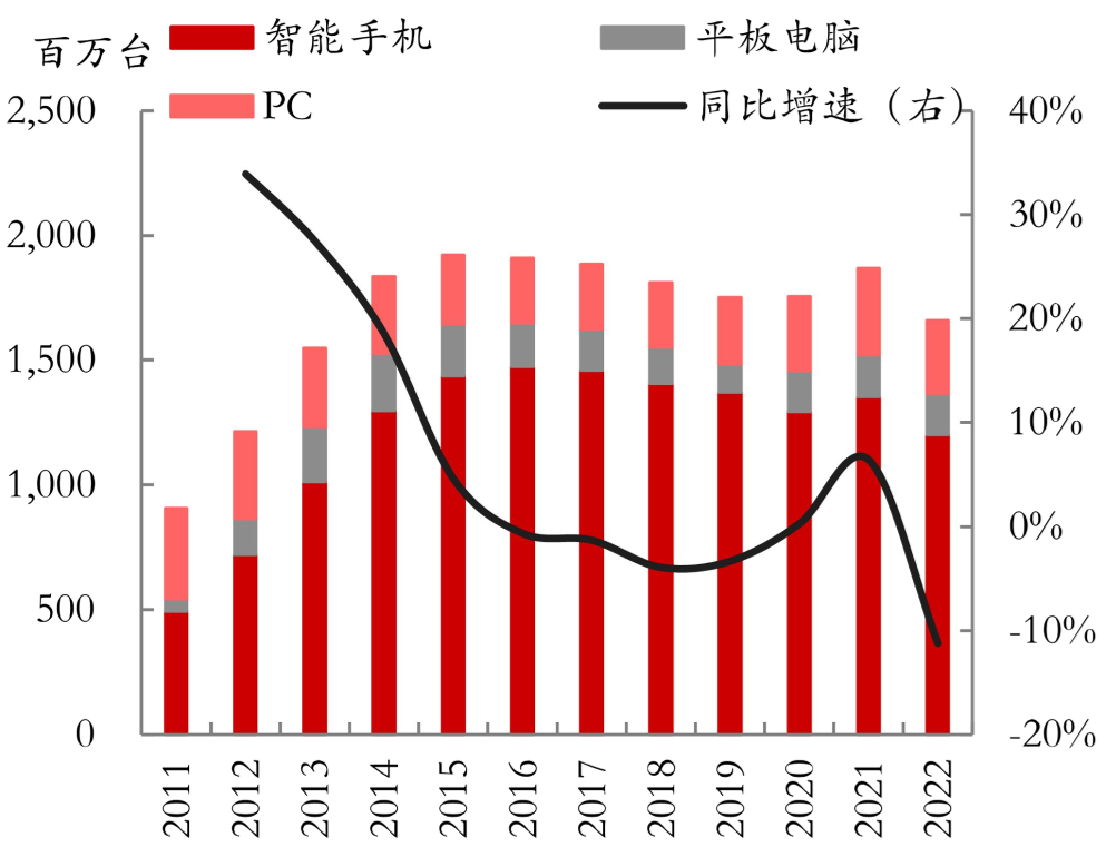 东证期货研究报告显示,2021 年以来,全球智能手机、平板电脑和 PC 的出货量和增速均呈下滑趋势。