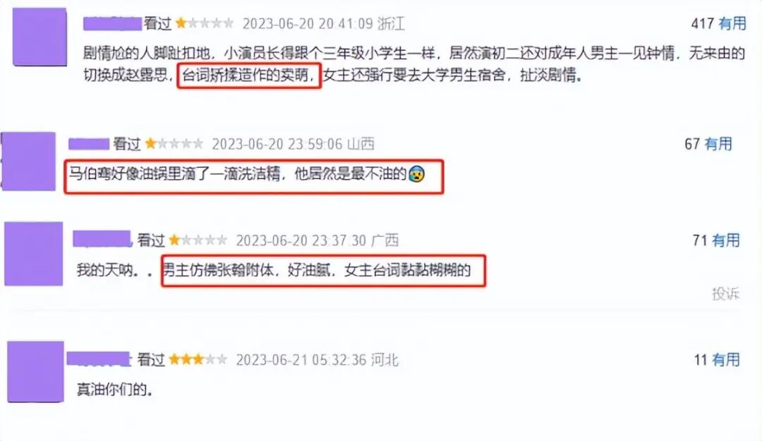 “女主角在拍戏时,声音偏高,如同夹着嗓子说话,而剧中她饰演的初中生和高中生角色却给人一种油腻感。”