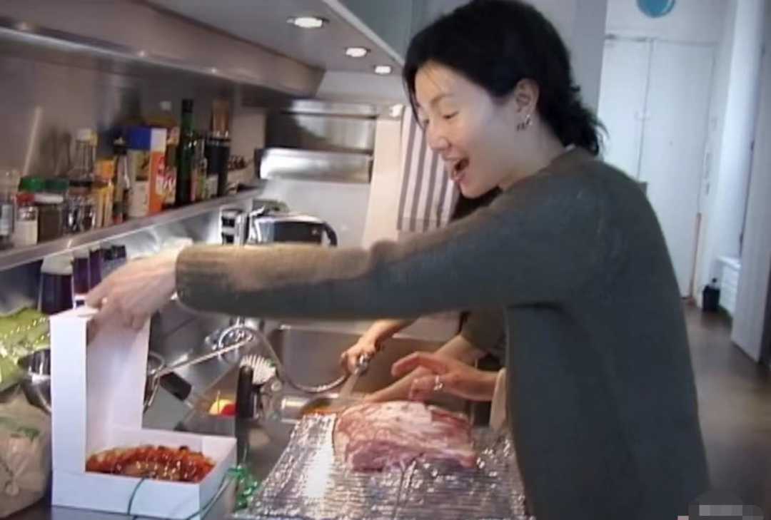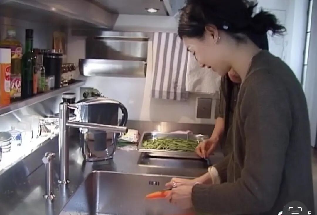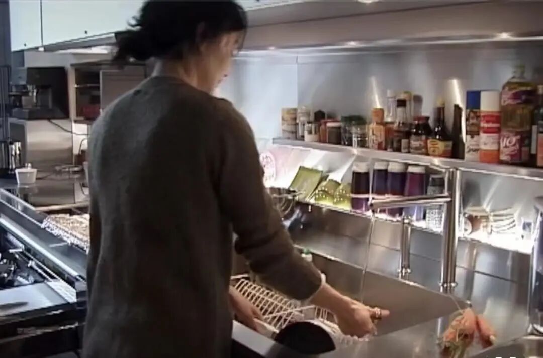 镜头记录下她熟练的家务动作,时而她拿起抹布在水槽里清洁煮锅,时而又拿起刀子,敏捷地削掉胡萝卜的皮。每一个细节都显示出她在家庭生活中经常下厨制作佳肴。