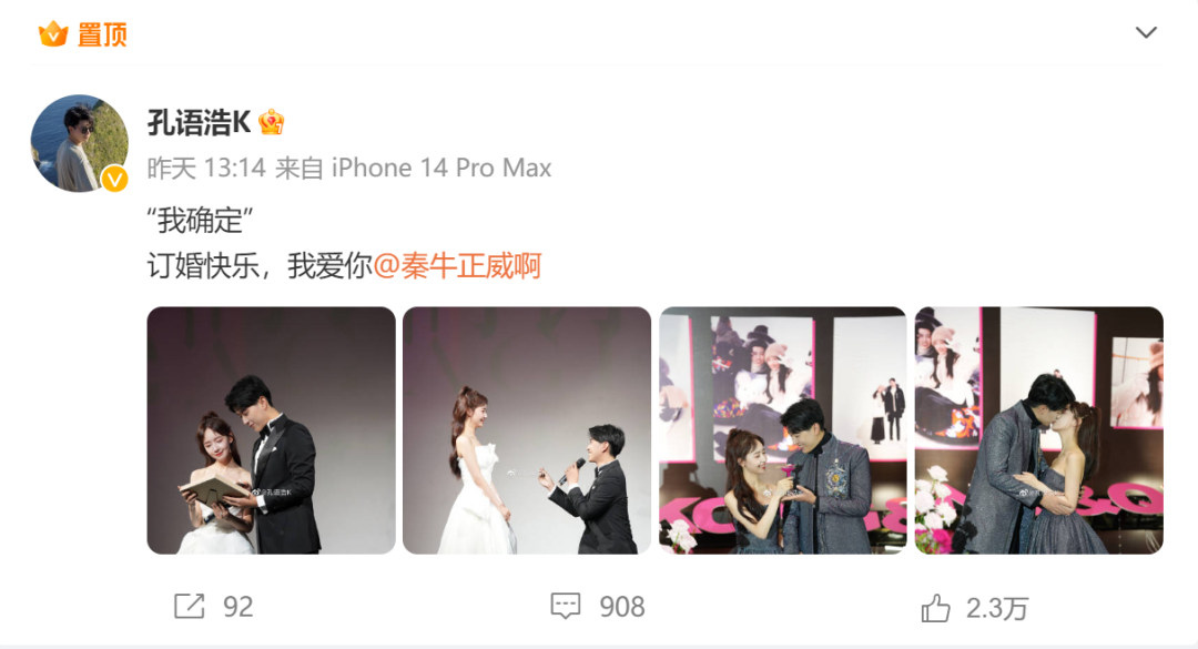秦牛正威主动发文官宣,分享了自己跟演员孔语浩订婚的喜讯。