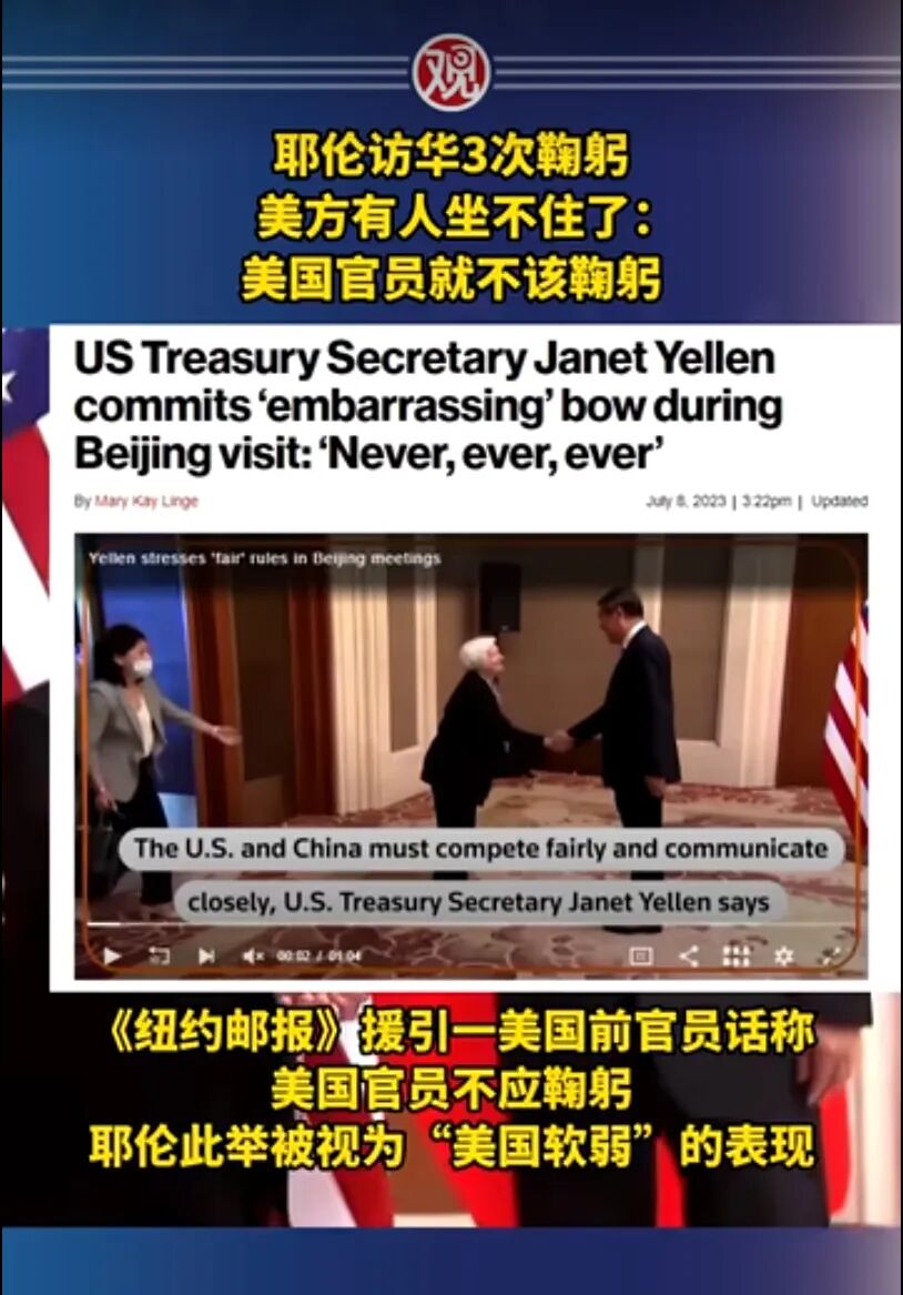 鉴于中美的大关系背景,耶伦来了也没给红毯,地上的那根红线也留着,待遇和布林肯一样,但双方在飞机下握手长达20秒,彼此态度上比当初的布林肯要亲善多了。从中美双方的公告来看,结果就是谈了个寂寞,基本啥成果都没有。当然这本身就是符合预期的,一开始就没人指望耶伦访华能谈出啥出来,毕竟中美关系的大背景摆在那里。即便没谈出成果,双方谈一谈本身就是好事,至少增加了友谊,是在把中美关系向好的方向去推动,总归来说是好事而不是坏事。以上是中国的主流看法,但美国那边的看法可就不一样了。对于耶伦访华这件事在美国被热议最多的关键词,是鞠躬。耶伦在见中国副总理的时候,出于友善进行了礼貌性的鞠躬,这个画面根本没啥,甚至中国媒体都没报道过,下图是从美国媒体报道的画面中摘录出来的。很普通的3次礼貌性鞠躬,没有中国人觉得有啥,顶多算耶伦个人对中国的友善态度,但在美国媒体那里却掀起了滔天巨浪,给耶伦带来了极大的麻烦。短短几天之内,因为这个鞠躬,耶伦被美国媒体给骂成了卖国贼。耶伦访华时谈了啥基本没有美国媒体注意,但包括纽约时报、CNN、福克斯新闻等美国各大媒体都对耶伦鞠躬这个事进行了大幅报道。耶伦的这一举动,丢了美国的面子,从来没有任何一个美国官员会做出这种动作,这就好像她是个小学生,被校长叫去谈话了一样。