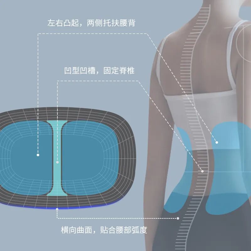 科学的双D人体工学分区设计刚好把脊柱夹在中间,只揉捏两侧僵硬的肌肉,完全不会按到骨头。再加上横向曲面,30mm按摩深度,贴合腰背托扶减压,保护脊椎释放压力!