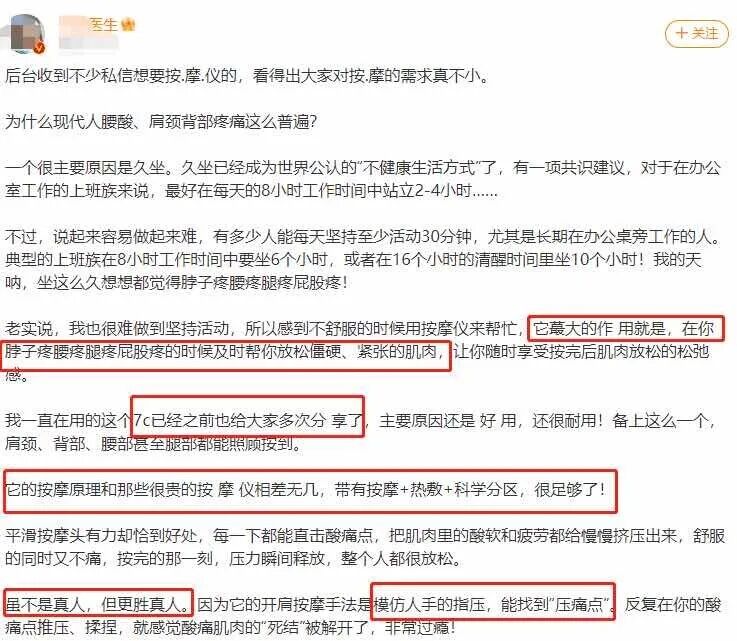 有些舒服是舒服,但根本没办法改变自己腰酸背痛的老毛病,该痛还是痛!为了腰部的健康,大家可以买一个能改善劳损,舒缓解压的按摩靠枕!今天就给大家推荐一款能够周全护腰的【7C大黄蜂按摩靠垫】。某红书很多薯友们都在用的一款【7C大黄蜂按摩靠垫】!大家反馈效果都不错,兜兜转转发现它家按摩仪比市面上的更能直击肌肉“痛点”。平时在医院的医生也顶不住腰酸疼痛都会用它放松僵硬、紧张的肌肉。且不说火不火吧,就连医生都说“虽不是真人,但更胜真人”,那肯定要试试!这不,咱们选品赶紧联系了品牌方,拿到手就迫不及待拆开,外观就像“枕头”一样~凹槽的位置,能够固定脊椎,周边的横向曲面,更加贴合腰部弧度~久坐导致的僵硬酸痛上至肩颈斜方肌下至腰间,它都能照顾到!