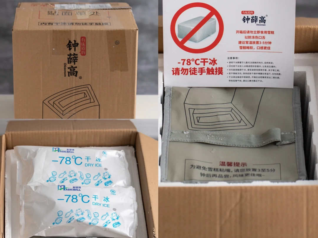 为了保障到各位手里都还是结结实实的,钟薛高使出了顺丰冷链配送+-78℃干冰的“冰凉护法”。