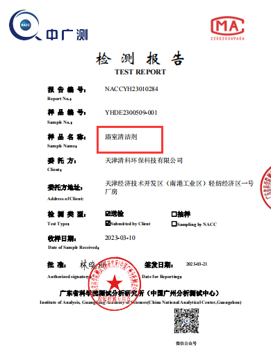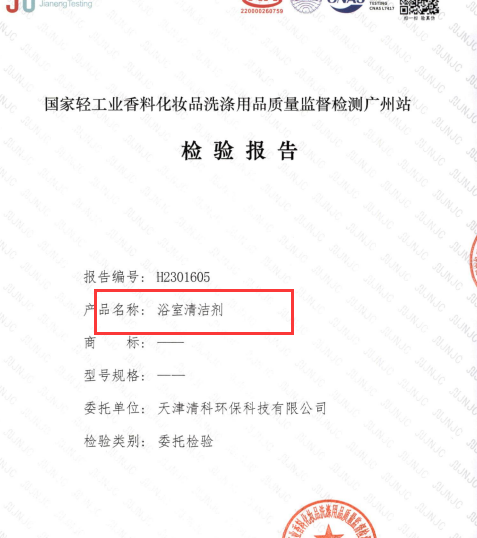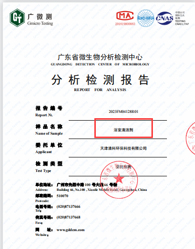 经过权威机构检测,清清雨洗浴室清洁剂的去污力大于标准要求。