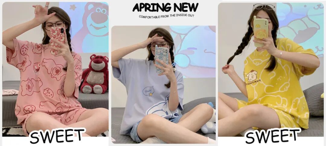 对待睡衣很邋遢随意?但实际上我们穿睡衣的时间也一点都不比外出服的时间少。人有三分之一的时间是在床上度过,一件好的睡衣决定了你的睡眠质量,也决定了你三分之一人生的质量。当你选到合适材质的睡衣,可以让在家休息的时间放大你的舒适感。恰好当季,今天就从近期选到的既透气舒身,颜值在线,同时也是性价比非常高的一款推荐给大家。『轻梵』卡通家居服套装