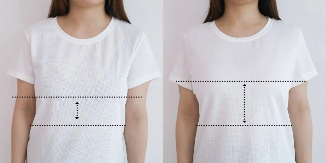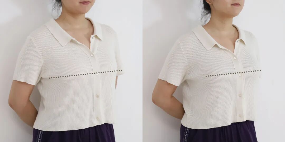 左图穿着普通无钢圈内衣,胸型比较松散,显得身型宽、厚,体态也没有自信。