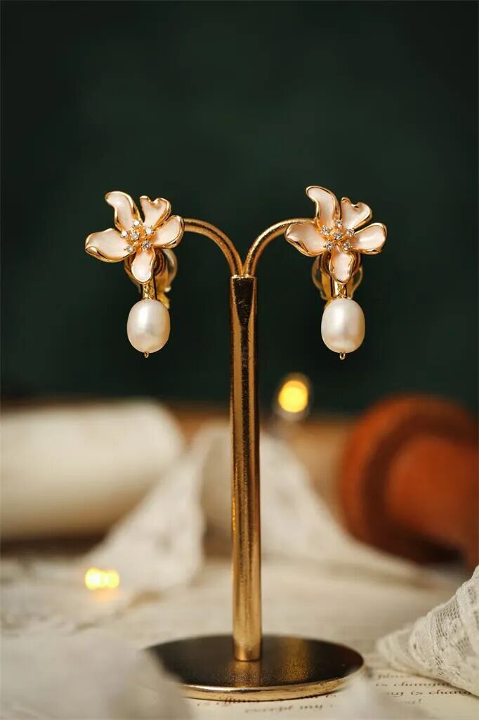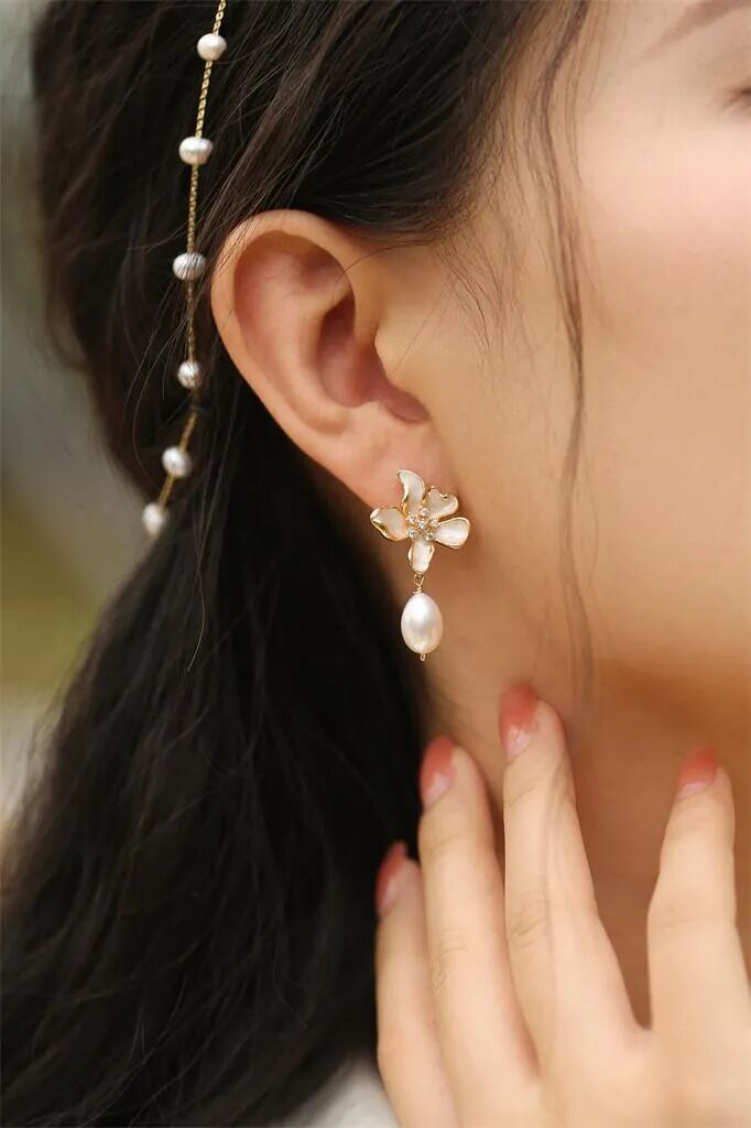 白色珐琅的冰清玉洁的白玉兰搭配淡水珍珠,上耳吸睛亮眼,尺寸能和谐面部的宽窄比例,菱形脸、圆脸妹子一定要试试。
