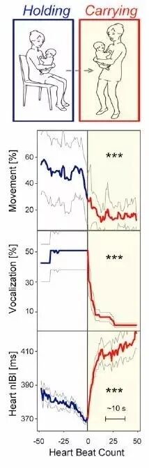 人类社会已经高度发达,高度富裕,抓握反射已经没啥用了,但这个东西能让你了解到人类本能的强大。哭,只是婴儿求助的一个信号,仅此而已,没有婴儿是为了哭而哭的。当幼猫的母亲咬住其后颈肉进行运输的时候,幼猫越安静生存概率越大。当婴儿遇到危险的时候发出哭泣,可以第一时间招来父母的救援。但是当父母已经抱住婴儿,甚至在迁移的途中,那婴儿的哭泣是没有任何作用的,反而会降低自己的生存概率。所以当父母抱起婴儿走路的时候,所有的婴儿都会立刻安静下来,而且几乎是瞬间安静,就好像是幼猫的后颈肉被夹住时全身立刻僵硬一样神奇。在抱着走路的模式下,只有婴儿真的极度难受或者饥饿的时候,才会哭几声求救,其他时间都超级安静。在某些农村,当父母背着婴儿在田间地头劳动时,你会发现婴儿可以一整天都不哭不闹,一直安静的趴在父母的身上。这种神奇的现象曾经引来了科学家的关注,他们对新生儿进行了研究,发现当他们被妈妈“坐着抱”和“走着抱”时,动作行为、哭泣行为,甚至是心电图,都发生了明显的剧烈变化。 还有个更神奇的,当妈妈怀孕时,如果孩子胎动太厉害,那么只要妈妈站起来走动,肚子里的宝宝立刻就会安静下来。