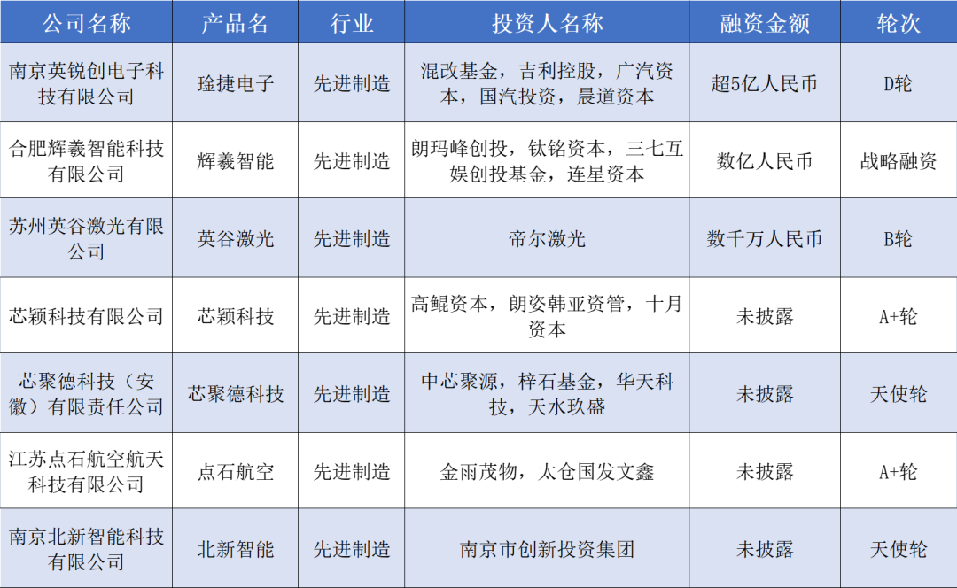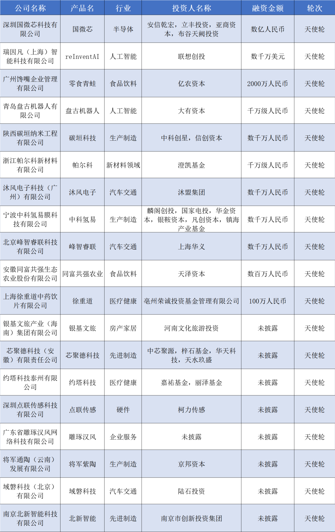 细分行业融资深圳国微芯科技有限公司是一家具备国际竞争力的EDA企业,拥有领先的EDA关键核心技术,主要产品及服务包括设计后端EDA工具、制造端EDA工具、IP设计、DFT设计服务及后端设计服务等。冻品云是一家冷冻食材B2B供应链平台,利用互联网打破行业信息不对称,降低交易成本。通过建立线上、线下便捷的供应链服务,压缩食材流通的层级,减少中间环节的损耗,帮助餐饮商家解决采购难题。南京朗博特动物药业有限公司成立于2017年12月,位于国家级南京高新技术产业园区南京市生物医药谷,是一家研发驱动型高科技动保企业,专注于宠物创新药的研发、生产和销售。赋乐科技源于清华大学网络安全实验室,是一家聚焦于“网络空间大数据智能化”的国家高新技术企业。核心团队十余年来聚焦网络空间安全与大数据智能化研究,推出涵盖4G/5G以及宽带网下的移动互联网、工业互联网和车联网等网络空间场景的新一代大数据智能化平台产品。银基文旅是一家房地产开发及旅游度假区运营服务商。已发展成为集主题娱乐、休闲度假、商业规划、运营管理、项目管理于一体的大型综合文旅集团。湖南顺华锂业有限公司是一家以废旧锂离子电池安全无害化再生利用为宗旨的科技型中小企业公司,运行着国内的磷酸铁锂废粉选择性浸出生产电池级碳酸锂(1000t/a)生产线,可直接制备电池级碳酸锂,产品均可返回到锂电产业链,实现废旧磷酸铁锂物料的定向循环。财信吉祥人寿保险股份有限公司是湖南省首家本土保险法人企业。公司不断创新金融保险服务模式,持续提升客户体验,形成了以保障型产品为主,覆盖客户全生命周期的寿险产品体系。公司构建了线上、线下立体化的客户服务体系,通过移动客户端、官网、官微及电话中心等线上管理平台,依托分布广泛的线下服务网点和合作机构,为客户提供保险服务。南京趣酶生物科技有限公司采用合成生物学创新工艺为工业客户提供食品、材料、农药、能源、生物医药等产品原料。工艺采用植物基原料(如淀粉、葡萄糖)、生物质原料(如玉米秸秆、稻杆、麦杆)等生产天然产品和生物基产品,使工艺符合“碳中和”、“绿色化工”的要求。海兰寰宇采取“企业自行建设、政府及其它涉海客户购买服务”的模式,服务涉海客户包括海洋渔业、海洋环境、海洋维权、海洋水文气象保障、海上搜救、港口海运、海洋资源开发、海洋养殖、海上风电、海洋区域保护等。西域旅游开发股份有限公司的主营业务为旅游资源的开发经营,通过对景区景点的开发,为游客提供旅游服务,主要包括旅游客运、高山索道观光、游船观光、温泉娱乐、旅行社业务和文化演艺等其他服务。左岸芯慧拥有物联网核心专利技术,并致力于帮助农企打造数字产销一体化的新型经营管理模式,将物联网、卫星遥感、云计算和大数据等最新的信息技术应用在农业领域,为农企提供物联网环境监控、水肥一体化智能灌溉、数字化农场管理和农产品社区团购等IT产品和服务,并为渠道和政府提供数据化品控溯源和区域农业大数据监管等整体解决方案。郑州云智信安安全技术有限公司(以下简称“云智信安”)成立于2019年。以“让安全成为数字经济的驱动力”为企业使命,将自身定位为“数据安全能力提供者”,聚焦于数据安全研发方向,着力在安全产品生产、安全服务提供上下功夫。经纬达汽车科技是国内外最早从事线控底盘与智能避撞技术研发的团队之一,拥有十余年深厚的技术积累。公司形成了完整的正向技术研发与产品开发流程体系,目前已与国内外多家汽车品牌主机厂和头部自动驾驶科技公司达成深度合作关系。reInventAI是一家人工智能基础大模型开发商,专注于基础模型和通用人工智能(AGI),旨在打造面向行业的专业大模型。致力于打造领先的SOTA(state-of-the-art)基础模型,对于部分行业,公司不仅提供可直接使用的预训练行业基础模型,还支持企业客户根据自身需求进一步定制专属基础模型。RED CHAMBER,国内彩妆品牌,以腮红为主营产品的个护化妆品牌。所有产品均不含矿物油,不含硅胶,无防腐体系,不含色素,不含香精,不含紫外线吸收剂,不含孕妇慎用成分。广东光晶能源科技有限公司,是由澳大利亚归国博士、北大校友团队以及佛山仙湖实验室联合创立的高科技企业。公司核心业务是研发高效率、长寿命的大面积钙钛矿太阳能电池组件,实现工业化大规模生产及销售。![]()