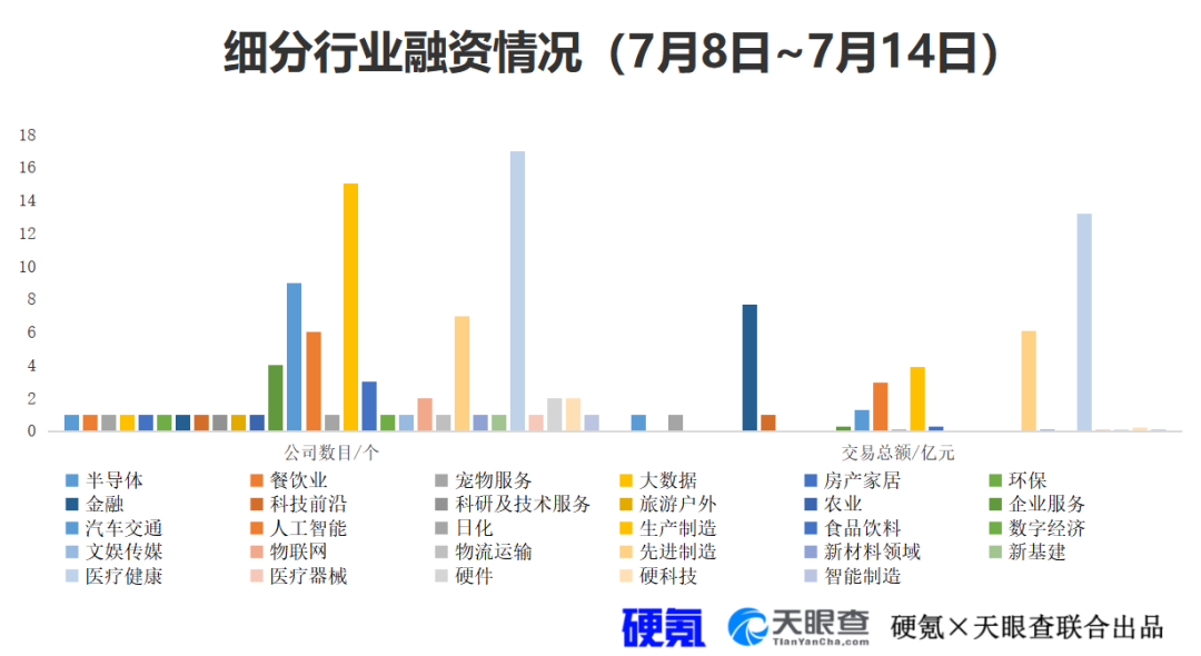 本周(7月8日~7月14日)全国共发生86起融资事件,较上周同比上升13.2%;近一周披露的交易总额超39.4亿人民币,较上周110.72亿人民币同比下降65.4%。本周融资主要分布在医疗健康行业;医疗健康行业披露的交易总额最多,达13.17亿人民币。
