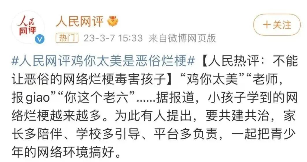 今年3月份,人民网发文《不能让恶俗的网络烂梗毒害孩子》,文中指出: