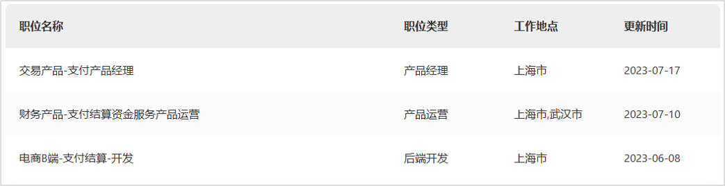 除“交易产品-支付产品经理”岗位外,小红书官网在不久前的6月8日、7月10日还更新了“财务产品-支付结算资金服务产品运营”和“电商B端-支付结算-开发”两个与支付相关的岗位,招聘数量均为1人。