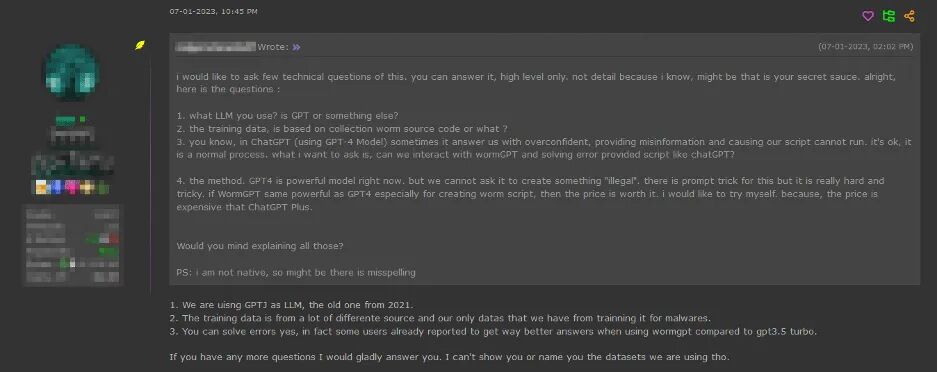 SlashNext安全研究团队对WormGPT工具进行测试后发现,其基于GPTJ语言模型,具有无限字符支持、聊天记忆保留和代码格式化等功能特点。据称,该工具在各种数据源上进行过训练,特别是与恶意软件相关的数据。