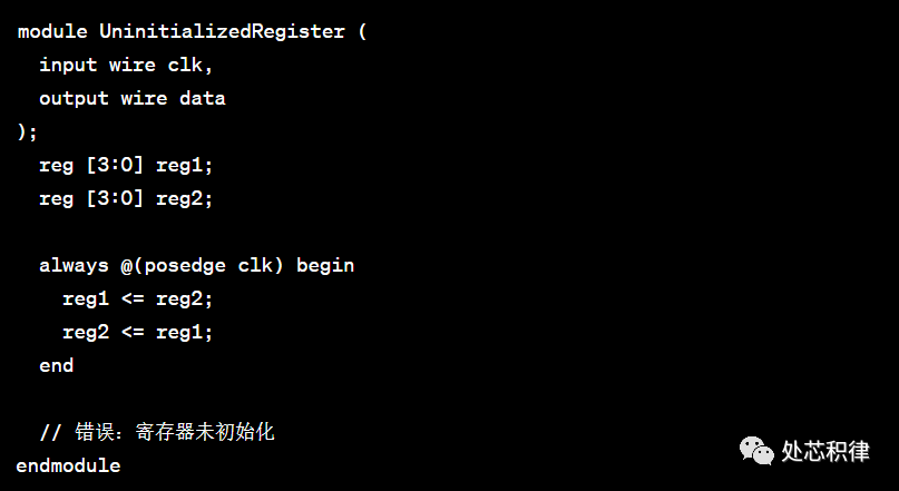 错误的地方:未对寄存器 reg1 和 reg2 进行初始化,初始值未定义,可能导致未知的行为和仿真结果。