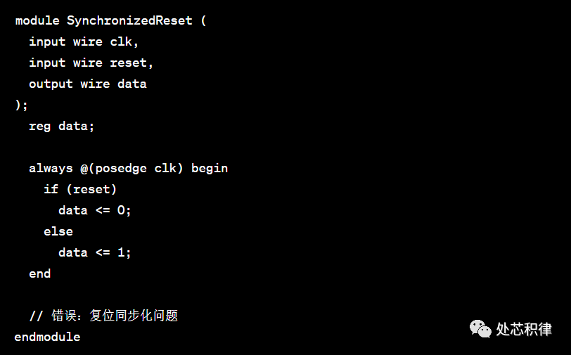 错误的地方:在时钟上升沿处处理复位信号,但未同步复位信号到时钟域,可能导致复位信号的抖动或同步问题。