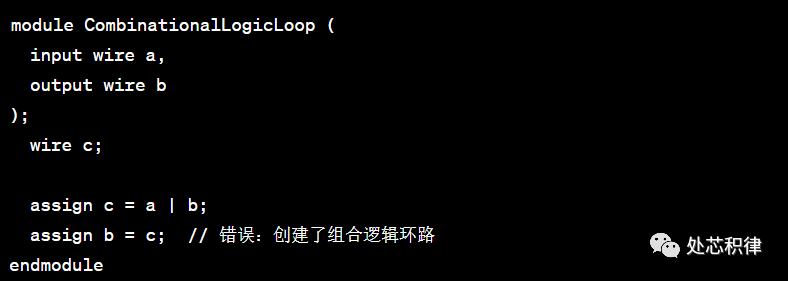 错误的地方:在连续赋值语句中,创建了组合逻辑环路,其中信号 b 依赖于信号 c,而信号 c 又依赖于信号 b,这会导致综合和仿真时的不确定行为。