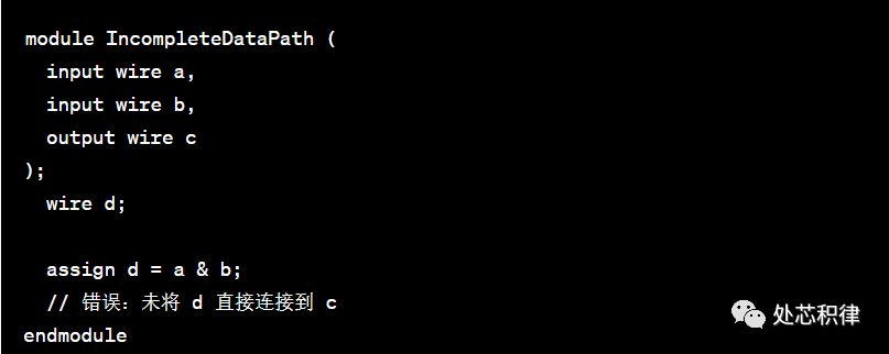 错误的地方:在数据路径中,信号 d 通过与门的连接计算得出,但未将 d 直接连接到输出 c。这可能导致输出 c 未能正确反映数据路径的结果,导致逻辑错误或意外行为。