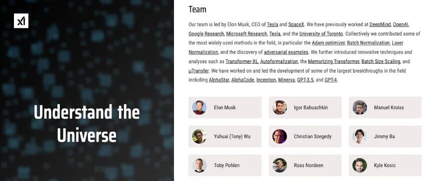 xAI的团队由马斯克领导,其他11名团队成员则分别来自 DeepMind 、OpenAI、谷歌研究院、微软研究院、特斯拉、多伦多大学等,成员整体都非常年轻,团队成员遍及硅谷、加拿大、英国等地。