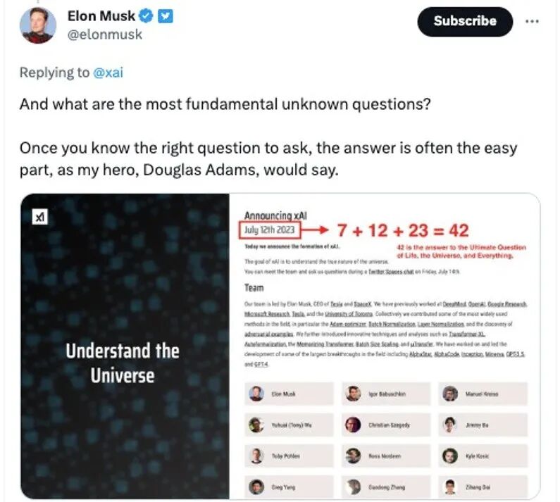 此外,马斯克又再一次的提到了他所钟爱的“42”这个数字。他在xAI的官方推特下配图回复,表示xAI发布的日期加总正好等于42。“42”在道格拉斯·亚当斯的科幻小说《银河系漫游指南》中,指代“生命、宇宙以及任何事情的终极答案”,被科幻迷广泛应用致敬。