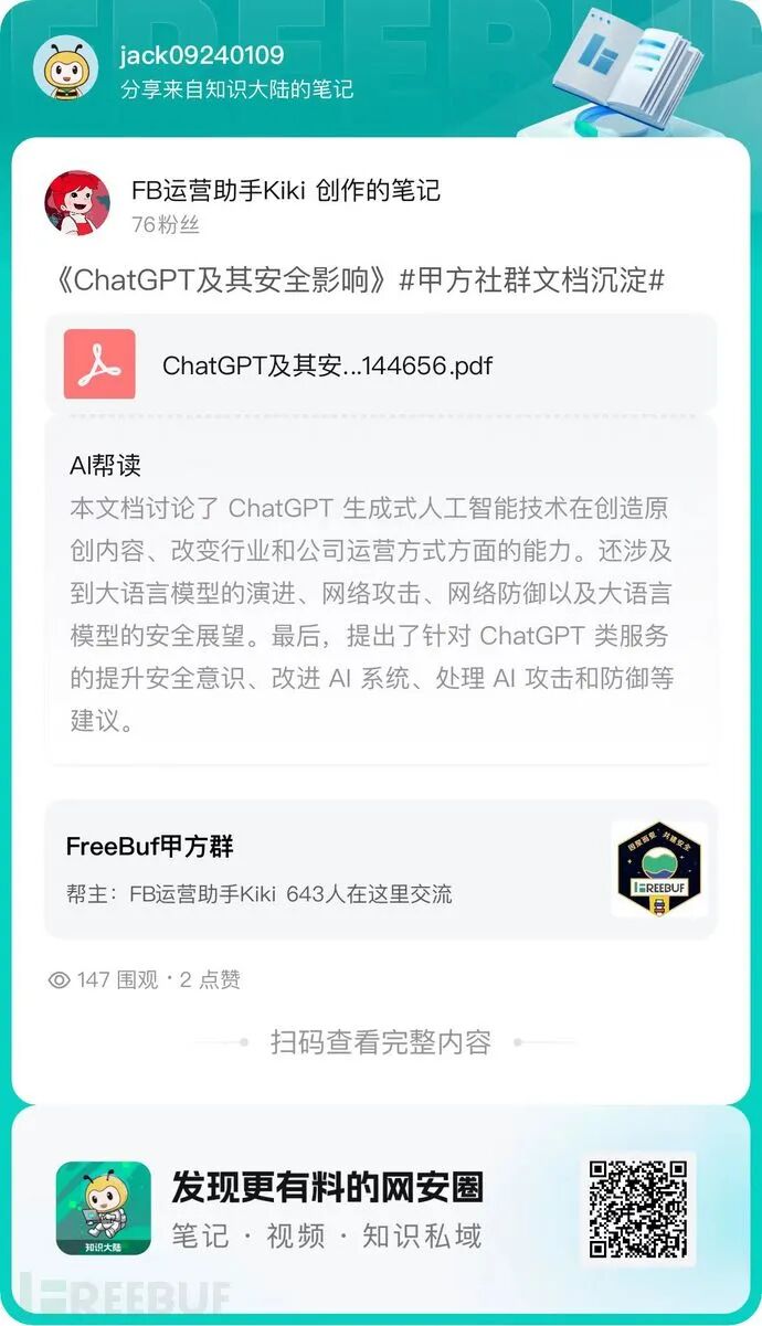 本文档主要介绍 ChatGPT的跨模态推理与生成能力。ChatGPT是一种基于深度学习的自然语言处理模型,具有强大的语言生成能力和跨模态推理能力。【FreeBuf粉丝交流群招新啦!