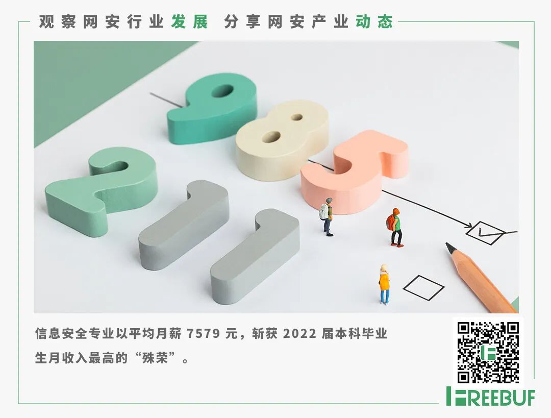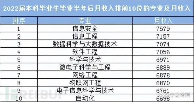 6 月 9 日,麦可思研究发布 2023 年版就业蓝皮书《2023 年中国本科生就业报告》《2023 年中国高职生就业报告》),并公布了2022届本科生月收入top 10榜单,信息安全专业以平均月薪 7579 元,斩获 2022 届本科毕业生月收入最高的“殊荣”。