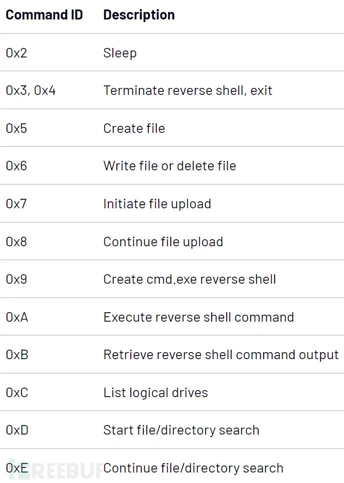 攻击的最后阶段,恶意软件将会回传所有数据。通信使用 HTTP、HTTPS、TCP 或者 UDP 的自定义协议以及 ICMP。该恶意软件还支持多种命令,包括文件传输、文件执行、远程桌面、屏幕截图、反向 Shell 与键盘记录。