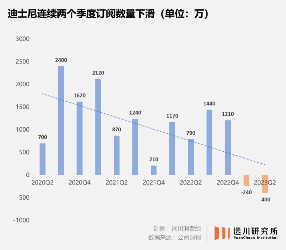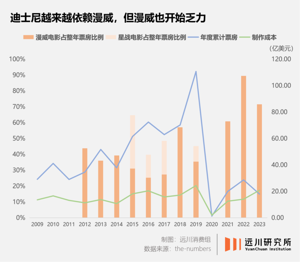 在迪士尼的商业模式里,动画、电影或者说创意内容,是形成一个完整商业闭环的基础。迪士尼的业务通常可以被分为四部分:影视娱乐、有线电视、流媒体、乐园及消费品。影视娱乐是IP供应商,而有线电视、流媒体是扩大IP影响力的分发渠道,乐园和消费品则是IP变现的载体。每个动画人物从大银幕走向迪士尼乐园的货架,才算完成一次商业闭环。但从迪士尼最近的电影票房来看,迪士尼的魔法似乎正在失灵。华尔街的分析师总结说:“迪士尼比任何公司都更依赖于其创意产出,而创意产出却没有发挥作用[3]。”受疫情影响,全球电影业哀鸿遍野,迪士尼也不能幸免。从2020-2023年,迪士尼的票房收入在20亿美元徘徊,而这只是2019年百亿票房的1/5,曾经被寄予厚望的漫威系列,也哑火了。从2012年开始,每年1-2部的漫威系列成为迪士尼稳定的现金流,贡献了迪士尼30%左右的票房。2020年,迪士尼没有上映任何一部漫威电影,而2021年的《黑寡妇》《尚气》《永恒族》,票房加起来都没有2018年一部《黑豹》的票房多。值得注意的是,2019年之后,七部漫威电影都未能在中国院线上映,直到2023年开春,中国观众给《黑豹2》贡献了1.06亿人民币的票房以及5.4的豆瓣评分。只是抛开疫情和中国市场影响,迪士尼也很难再造百亿票房奇迹。复仇者联盟、星球大战两大IP纷纷完结于2019年,短期内很难制造出如《复仇者联盟4》(28亿美元票房)一般刷新影史的增长引擎,青黄不接的迪士尼只能靠漫威英雄续集续命。糟糕的票房宣示了观众对漫威英雄续集的审美疲劳。观众在影院枯坐两小时,发现只是看了下一部的超长预告片。眼看《蚁人3》票房进账4.2亿美元,不仅低于两部前作,更是达不到漫威英雄10亿票房的及格线,迪士尼CEO艾格也坐不住了:漫威是否需要为超级英雄拍摄这么多续集[4]?倚仗着漫威这台印钞机,迪士尼工作室在自创IP这件事似乎不太努力,上一个被全球少年儿童捧上神坛的公主还是2013年《冰雪奇缘》里的艾莎。收购来的皮克斯工作室,票房也在走下坡路,2023年新片《元素总动员》上映当日票房收入仅2950万美元,这个曾经获得过19次奥斯卡金像奖的工作室遇到了30年历史上最糟糕的首映[5]。影视娱乐和主题乐园撑起了迪士尼一半的业绩,以疫情前的经营情况为参考,2019财年影视娱乐(16%)和主题乐园(38%)贡献了迪士尼54%的营收。2020财年,迪士尼净亏损28.6亿美元,出现近20年来首次亏损:一边是院线全面停摆,漫威英雄指望无门;另一边全球六大乐园普遍只营业了几个月,最严重的加州迪士尼闭园超过400天。对于此时的迪士尼来说,加注流媒体并不是一道选择题。