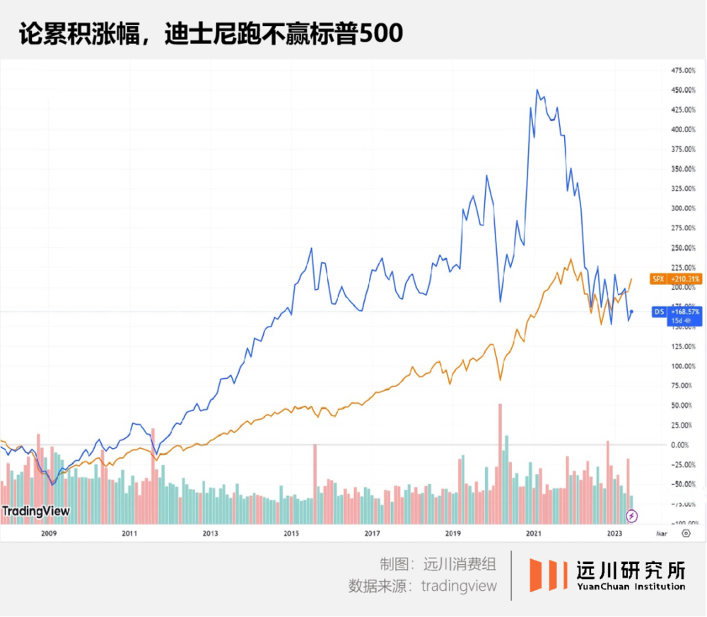 新一线城市在等一座迪士尼,至少从最近的传言来看是这样。成都、天津、青岛、武汉都开始争夺尚不存在的“中国第三座迪士尼”,随后被迪士尼一一否认。新一线们争着抢着要蹭迪士尼,原因在于一座迪士尼就能重塑整座城市的想象力,首先就体现在房价。2009年11月4日,距迪士尼3km的一块住宅用地A08-03因“迪士尼概念”,在经历16轮报价之后,以高出起始价264%的溢价幅度完成出让。一个半小时前,上海迪士尼才刚拿到国务院正式批复[1]。开业三年,迪士尼固定投资对上海GDP年均拉动0.13%,年均间接提供岗位6万人次。开业七年,成千上万的游客从全国各地赶来,为上海贡献旅游收入615亿,这些钱足够造74个东方明珠。但热情的中国城市,拯救不了迪士尼当下的窘境:躺在地上的电影票房、越努力越心酸的流媒体业绩、饱受争议的文化立场……反映到股价上,过去十年,迪士尼一直跑赢大盘的存在,到了2022年,迪士尼股价腰斩,且罕见的被大盘甩在身后,市值相比最高点已经跌去了2000亿美元。《财富》杂志如此评价:“没有哪家像迪士尼一样快速地王子变青蛙[2]”。