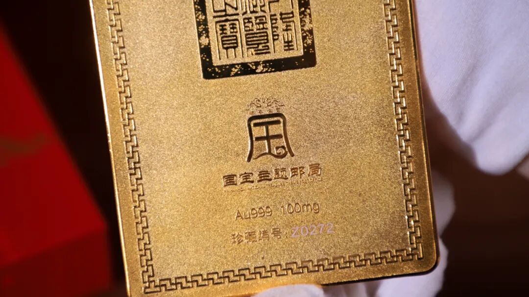 每块浮雕金砖的外壳包装上都印有邮局防伪标识。