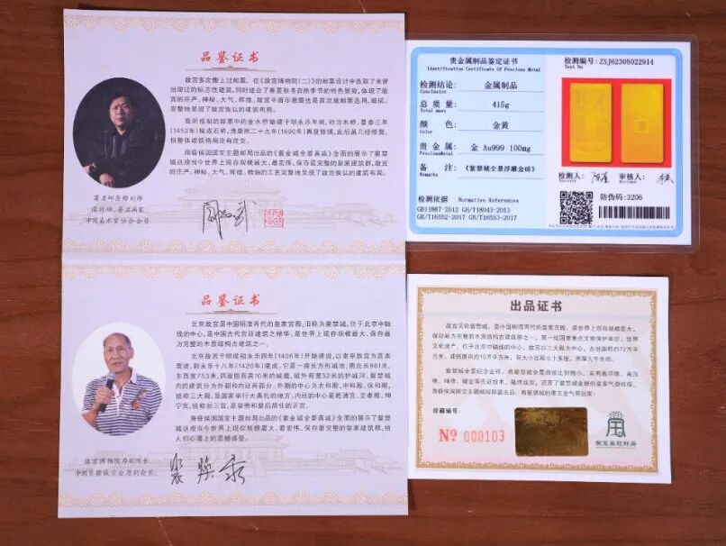 每套《紫禁城全景浮雕金砖》内都有4张证书:贵金属鉴定证书、出品证书、裴焕禄先生和阎炳武先生的品鉴证书。