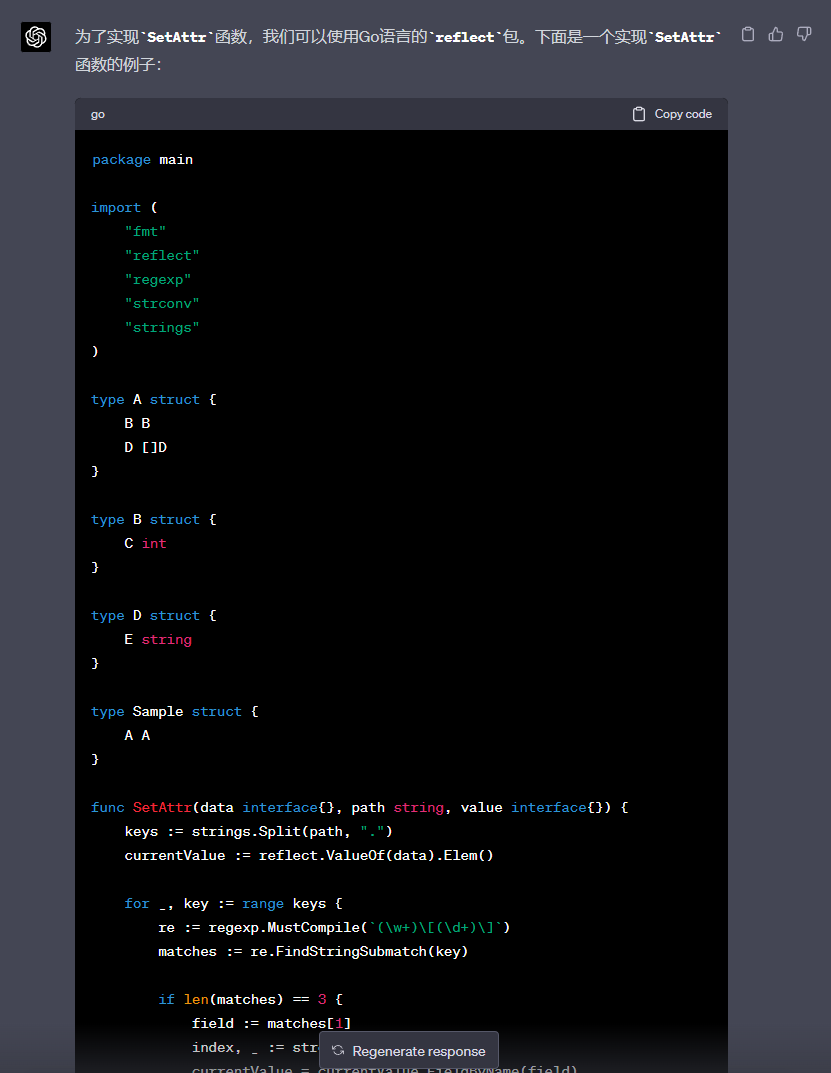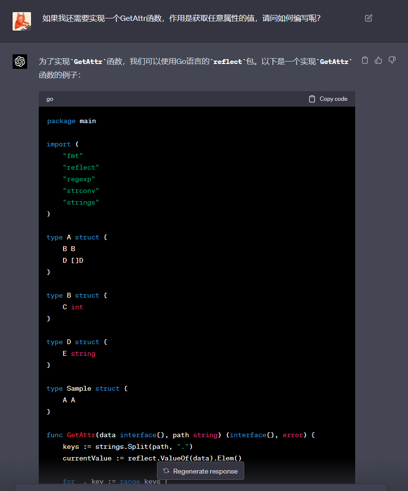 ChatGPT返回给我的函数,看起来大致没有什么问题。接着,我还让其帮忙生成了与SetAttr对应的GetAttr函数,由于前面已经生成过SetAttr,所以对于GetAttr函数的描述可以比较简单,GPT4具有一定逻辑思考能力: