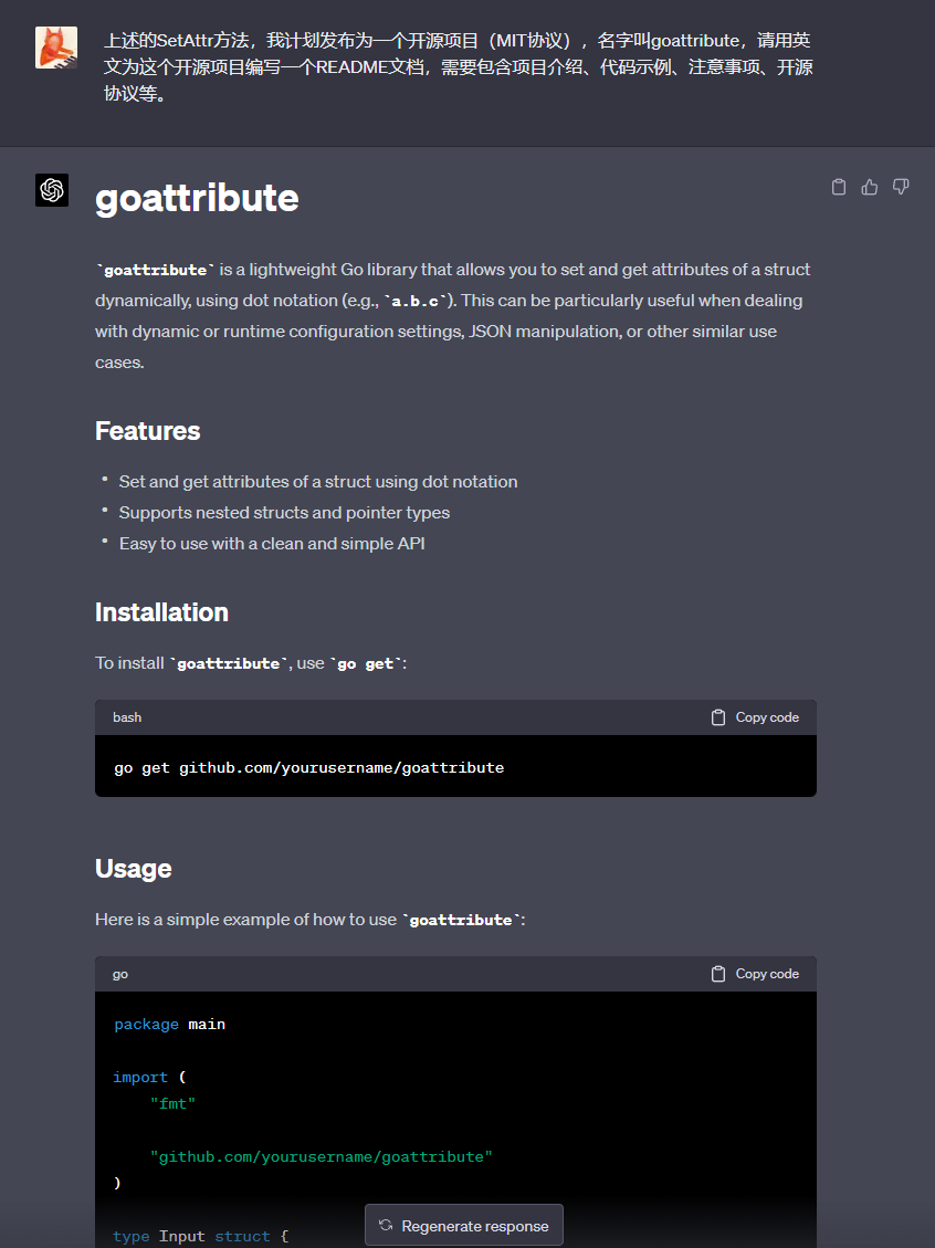 完成了代码开发,我们可以让ChatGPT帮忙生成一下README: