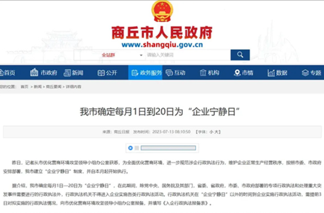 据商丘日报,近日,河南商丘市确定每月1日—20日为“企业宁静日”,引发热议。规定称,在此期间,除党中央、国务院及其部门,省委、省政府,市委、市政府部署的专项行政执法和处理重大突发事件需要进行的行政执法外,行政执法机关不得进入企业实施各类行政执法活动。行政执法机关在“企业宁静日”以外的时间到企业实施行政执法活动,需提前3日对拟实施的行政执法情况,向市优化营商环境攻坚领导小组办公室报备,并填写《入企行政执法报备表》。对此,商丘发改委一名工作人员表示,目前可能会与其他部门在工作时间上存在冲突,会不断观察执行过程,进行完善优化。同时,商丘市将严格实行入企行政执法检查扫码登记制度。依托各县(市、区)“码上监督,马上服务”系统,行政执法机关执法人员进入企业进行执法检查前,应扫描入企检查“监督码”进行信息登记,主动出示《入企行政执法报备表》和行政执法证件。行政执法人员要严格按照《入企行政执法报备表》所列内容进行行政执法,不得擅自扩大执法范围、延长执法时间。执法结束后,执法结果要于3日内上传企业所在县(市、区)“码上监督,马上服务”系统。商丘市市委全面依法治市委员会办公室、市优化营商环境攻坚领导小组办公室将对“企业宁静日”制度执行情况进行监督,对发现违反规定入企进行检查活动的,按照程序追究相关执法单位主要负责人及相关人员行政责任,并对执法单位进行通报批评。另据九派新闻报道,7月14日,商丘市优化营商环境攻坚领导小组办公室的工作人员介绍,“企业宁静日”政策针对全市所有企业,目的是全面优化营商环境,进一步规范涉企行政执法行为,维护企业正常生产经营秩序。“此政策自上周五开始施行,至今已有一周时间,对工作量的影响不大。”上述工作人员介绍,政策施行期间,确实存在一些问题,比如在12345接到的投诉需要在一定期限内处理完毕,但该期限可能会与“企业宁静日”的时间冲突,无法按时执法。不过,针对出现的问题,政策也会不断修正完善。另据大众日报报道,日前,山东省临沂市政府新闻办召开的新闻发布会上确定,临沂市将建立“企业宁静日”制度,每月1日至20日期间,除安全生产、生态环境、食品药品等重点领域以及上级部署、投诉举报、媒体曝光等需要即时检查的特殊情形外,各级行政执法部门原则上不对企业开展行政执法检查。同时,打造涉企联合检查平台,所有入企执法检查,均通过平台备案,实行“扫码入企”全过程监督。据菏泽司法消息,山东菏泽巨野县设立“企业宁静日”,每月1日至20日除安全生产、生态环保、公共安全等特殊重点领域和投诉举报外,各级有关执法部门不在“企业宁静日”期间入企开展执法检查。深化涉企行政执法智慧监督平台“麟智法”APP运用,落实行政执法规范化建设,要求执法检查事前报备、事中留痕、事后可评,涉企行政执法检查全要素、全过程监督,做到源头可溯、全程可控、风险可防、责任可究,拒绝涉企执法“任性检”,为企业发展创造良好环境。还有牡丹区也实施“企业宁静日”制度,为涉企行政检查划定工作期间。将每月中上旬设为“企业宁静日”,除重点领域外,各行政执法单位不得随意入企检查,坚决避免多头检查、重复检查,为企业生产经营减负,充分释放市场经济活力。要求各执法单位要在每年1月31日前编制行政执法年度计划,每月17日前编制下月涉企行政检查月度计划,明确入企检查日期、检查单位、受检企业名称、检查内容、检查依据、检查人员等内容,并将“两项计划”报送区营转办和区司法局进行备案。每日经济新闻综合自商丘日报、九派新闻、大众日报、菏泽司法