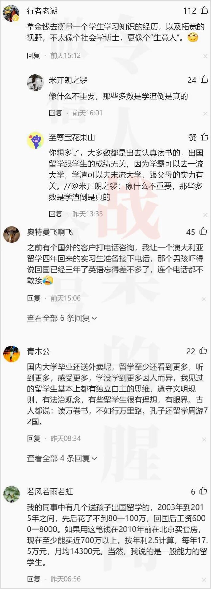7月7日,据新闻晨报“周到上海”援引老板联播消息,知名社会学学者、南京大学教授朱虹称,留学生人数在大大降低,主要原因还是留学的收益,它的回报率越来越小。朱虹表示学校系里有个秘书,本科是985高校,在英国读了硕士,花费百万回国月薪到手5000多元。“她们家培养她,教育投资至少150万以上,她的工作到手才5000多块钱。”还有很多欧洲可以花钱买的那种硕士,用人单位反映不好,后面职场空间就很小了。以前仅靠混文凭就可以获得溢价的时代终结了。“还有就是因为现在,欧洲的那些花钱就可以买的硕士,这些镀金的学渣回来后啊,用人单位反映不好,三五年后他们这个文凭的含量和职业空间就会越来越少了。”