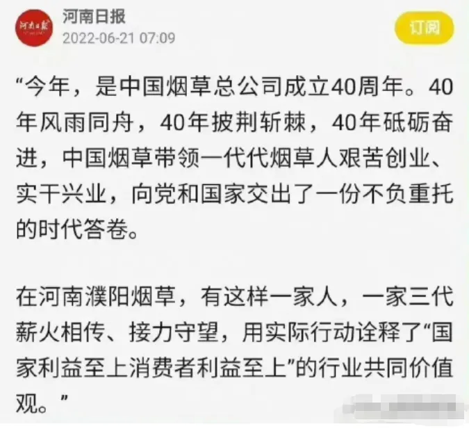 一家三代在烟草局工作,还被当作先进事迹上了党报。不得不让人感慨,烟草局的宣传负责人、河南日报的记者、编辑、总编没有三年脑血栓,写不出这种文章。