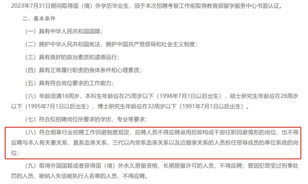 终迫于各方压力,2020年,中国烟草总公司发布烟草行业招聘工作管理新办法,提出“三代血亲任职回避”等新要求。